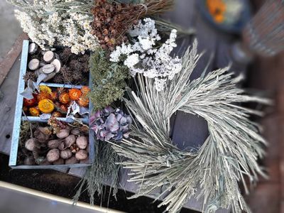 Two session options will be available. In the full 2-hour session, you will have an hour to create a beautiful evergreen and foliage base wreath. Though it will be lush and fantastic enough to hang all on its own, spend the next hour, in the second session, adding final touches like dried flowers, seed pods, berries, ribbon, and ornaments. If you'd like Anita to create the wreath base for you, just sign up for the final hour and make it all your own.